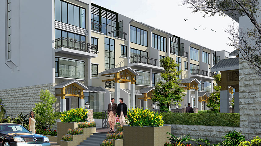 在總體布局上,花園社區(qū)內(nèi)住宅全部采用單元式直排布置手法有利于高效利用土地,戶甘道路將小區(qū)有機(jī)的分隔為相對(duì)獨(dú)立的組團(tuán)。小區(qū)住宅建筑主要由花園洋房(4+1 F)、多層(5+1F)、別墅、電梯公寓(11+1)組成,花園洋房約占75%左右。花園洋房底層住戶均設(shè)有花園,上層住戶設(shè)有花園露臺(tái),加大居住者與室外環(huán)境的接觸面,為住戶提供了良好的居住環(huán)境,內(nèi)部空間構(gòu)造為復(fù)式,在內(nèi)部空間的布置上為各種不同需求的居住者提供了豐富多樣的戶型和建筑面積,戶型建筑面積從220-300㎡;多層住宅的面積從120-170㎡,別墅面積360㎡。整體設(shè)計(jì)為新古典主義風(fēng)格,小車直接入戶,前后庭均設(shè)花園,通過(guò)外廊與親水走廊將別墅外景自然過(guò)渡到室內(nèi),建筑形式美首先體現(xiàn)在內(nèi)部空間的合理表現(xiàn)上,也蘊(yùn)含于完美比例的推敲和細(xì)部的雕琢上,在高度的比例,色彩的控制、屋頂尺度中創(chuàng)造一種基本建筑意象。電梯公寓建筑面積從92-125㎡,整體建筑力求簡(jiǎn)潔統(tǒng)一,含蓄而不張揚(yáng),把現(xiàn)代主義的空透開暢的美學(xué)特征同一種更為傳統(tǒng)的背景編制在一起,努力把建筑風(fēng)格與城市構(gòu)造結(jié)合起來(lái)。創(chuàng)造一種真正富有感染力、優(yōu)雅高貴的形象。