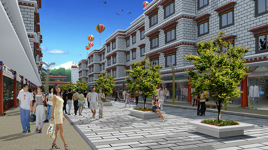 作為“嘉龍花園”開發(fā)項(xiàng)目中最具特色的子項(xiàng)目,為打造一條富有藏民族神韻的、展現(xiàn)原生態(tài)魅力的步行街,規(guī)劃設(shè)計(jì)采用大量藏式民居的建筑符號(hào),在建筑材料的使用上,全部選用西藏當(dāng)?shù)夭牧希袁F(xiàn)代建筑語(yǔ)言加以詮釋。經(jīng)反復(fù)論證,確定步行街入口由一組體量雄偉、彩飾華麗、造型質(zhì)樸的藏式牌坊、碉樓組成,充分體現(xiàn)藏民族悠久的歷史、燦爛的文化、精美的工藝;街道兩側(cè)商鋪、住宅(4+1 F)完全采用藏民族的傳統(tǒng)手法裝飾;步行街路面、行人休息座椅材質(zhì)以花崗石為主,以綠色植物、花壇等為其色彩綴飾,色調(diào)組合內(nèi)斂然張力十足;所有街景小品、燈飾、Parking等均著力表現(xiàn)藏民族的日常生活片段,竭力將藏民族最純粹的民風(fēng)、民俗一一展現(xiàn),創(chuàng)造出具有歷史文化傳承、鮮明時(shí)代特點(diǎn)的民族風(fēng)俗街。